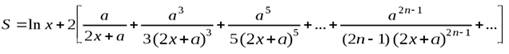 с точностью до члена ряда, меньшего e=10-4 для a2<(2x+a)2 и значение функции (для проверки) f=ln (x+a).