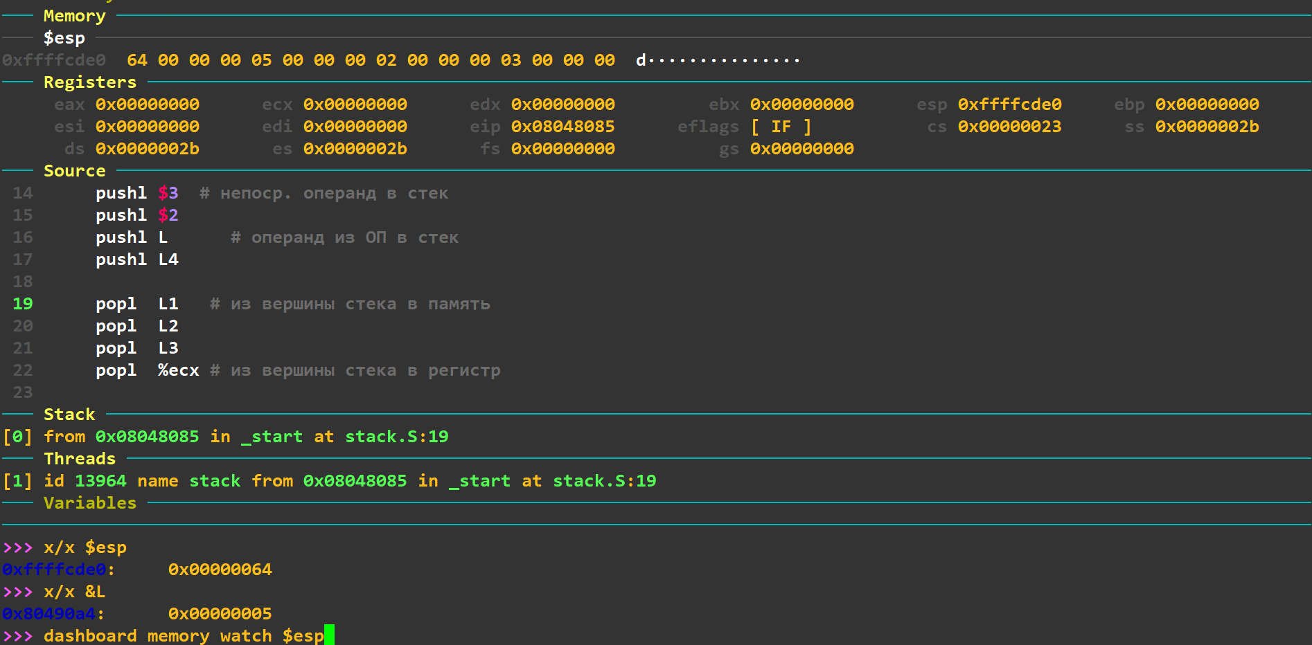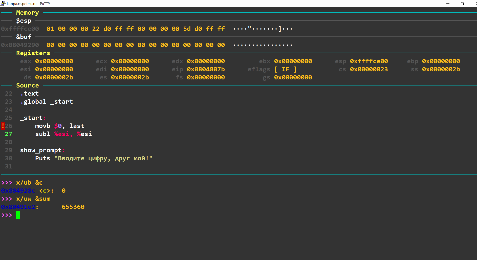 x/x $esp - вывод значения с адреса %esp в 16-ном видеx/uw &sum - вывод суммы типа word в 10-ом виде (unsigned decimal word)x/ub &c - вывод байтовой переменной в 10-ом виде (unsigned decimal byte)x/c &c - вывод переменной c как символа (char)Примеры окна отладки: