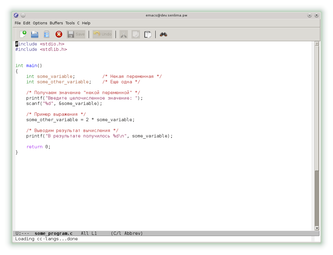 Откроем пример из предыдущего раздела инструкции в редакторе emacs.