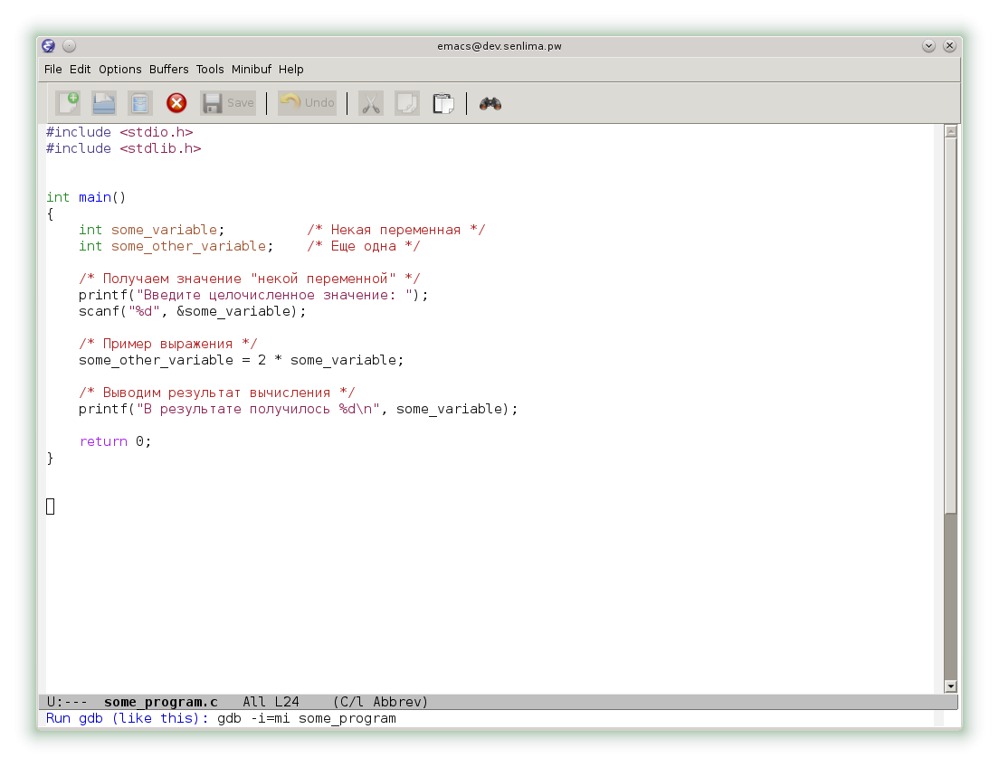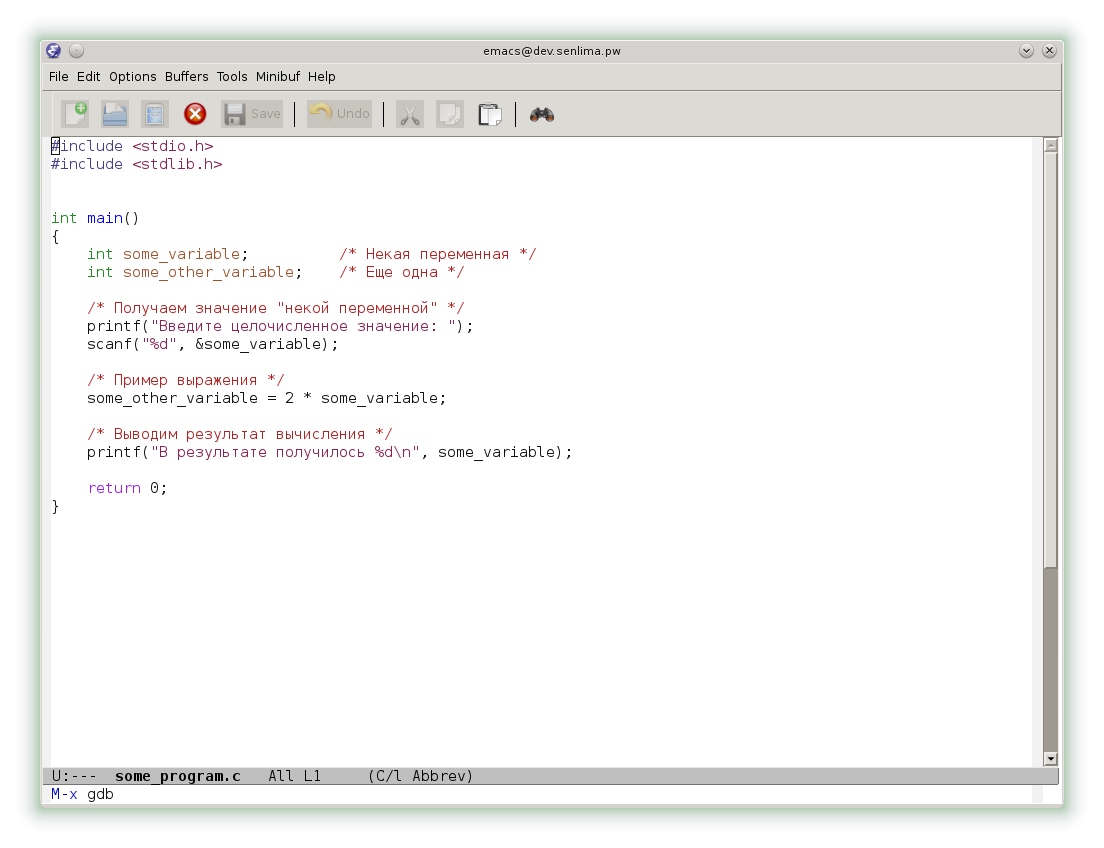 Перейдем к отладчику, используя команду M-x gdb (напомним, что клавиша M - Meta - на большинстве современных клавиатур соответствует Alt). Набираемая команда отображается в нижней части экрана.