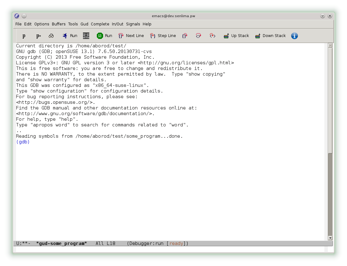 Теперь мы имеем возможность выполнять команды gdb в соответствии с предыдущей инструкцией. При этом команды можно не набирать, а использовать кнопки на панели инструментов.