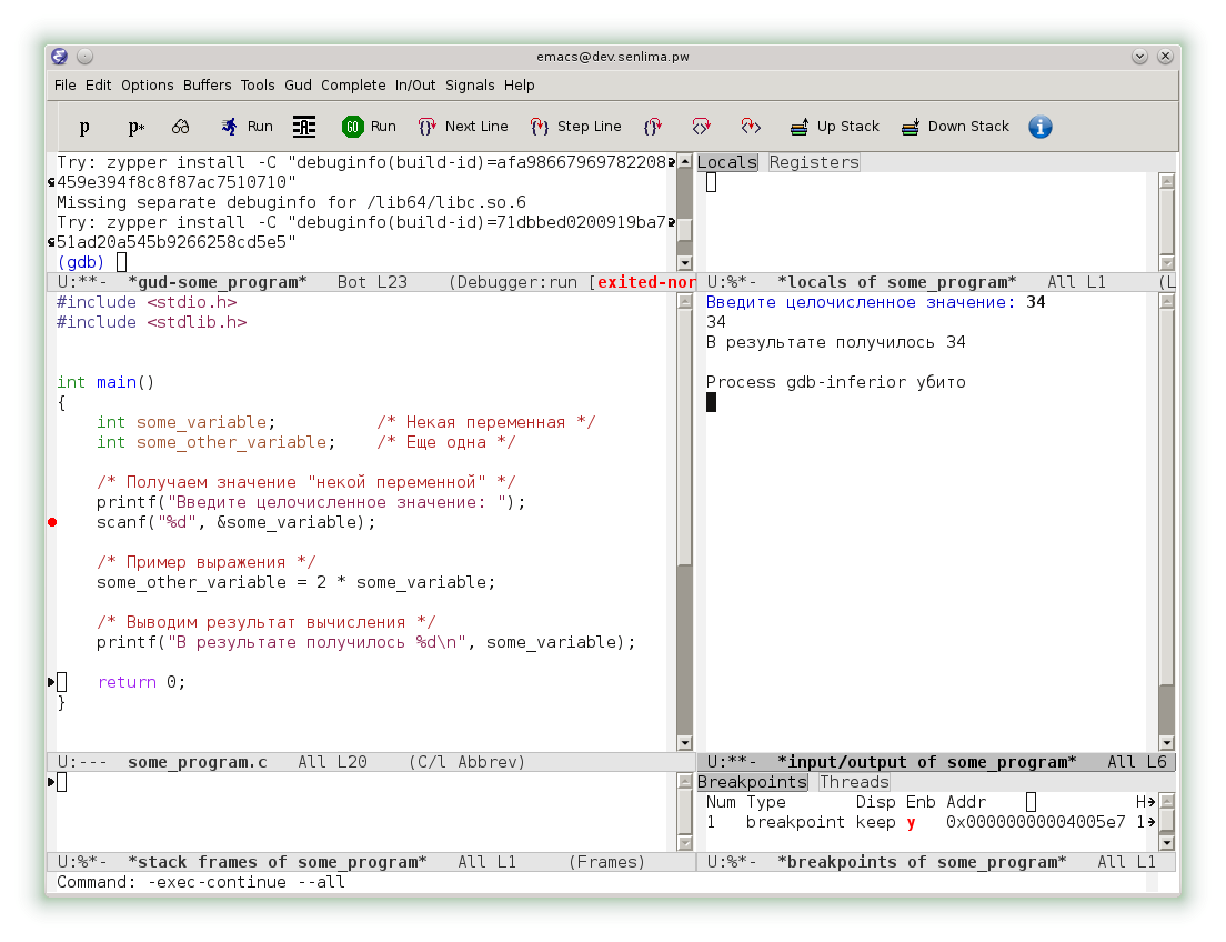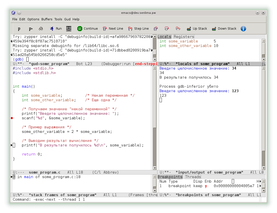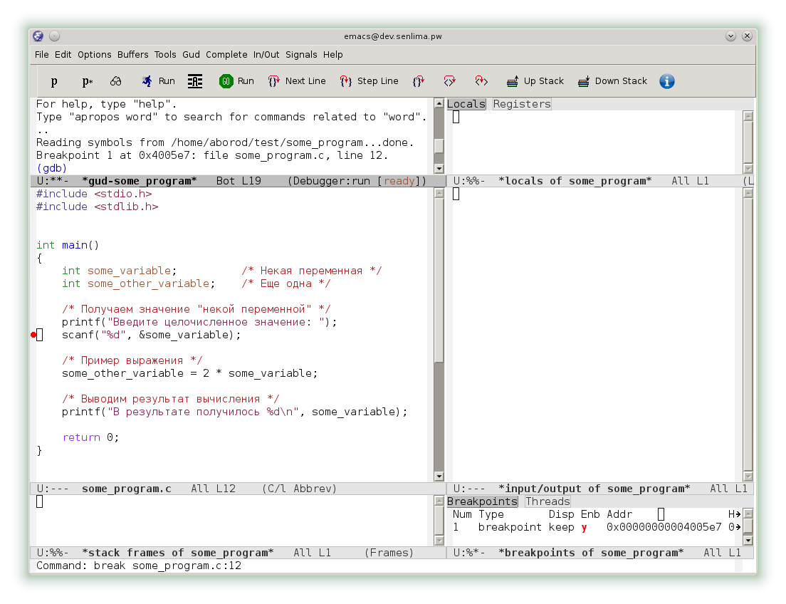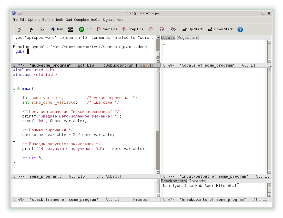 Однако, emacs предоставляет и еще более комфортный интерфейс. В меню Gud выберем раздел Gud-MI, а в нем пункт Display Other Windows. Теперь наряду с консолью gdb мы видим исходный код, локальный переменные, консоль ввода-вывода и другие окна.