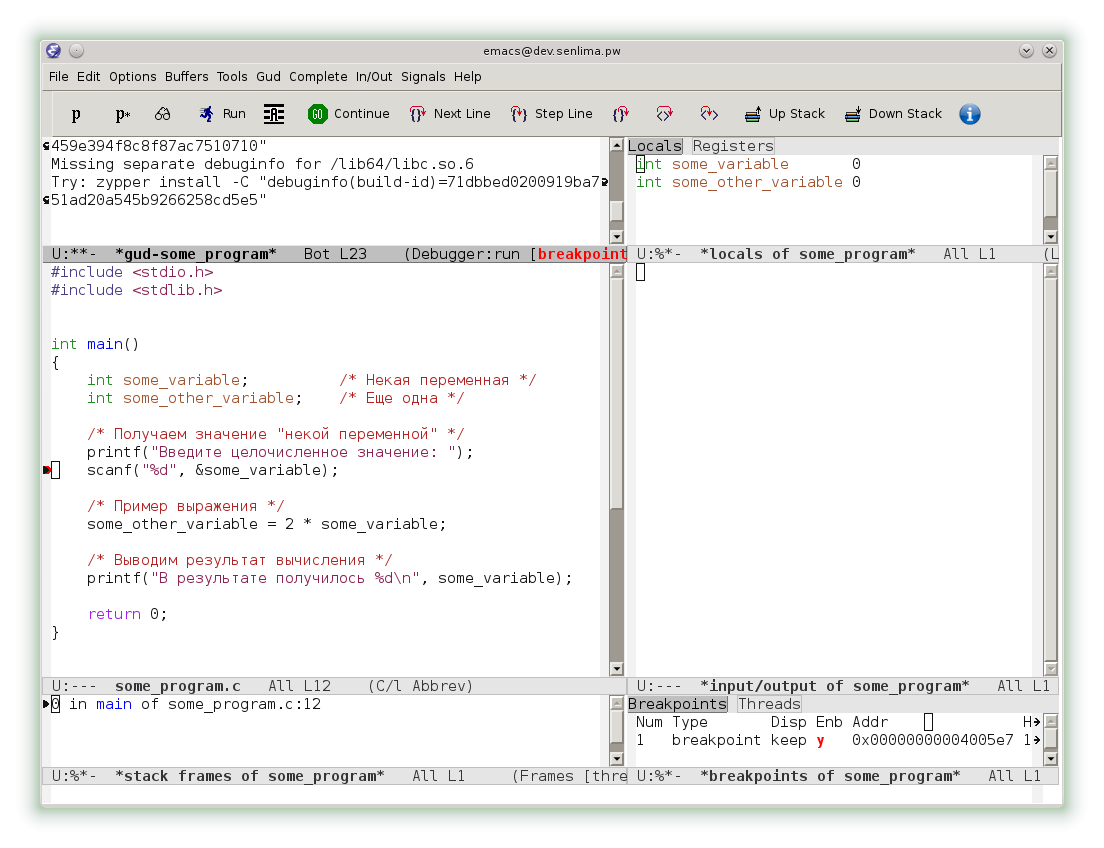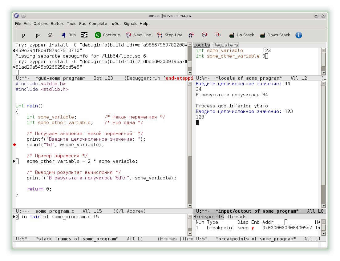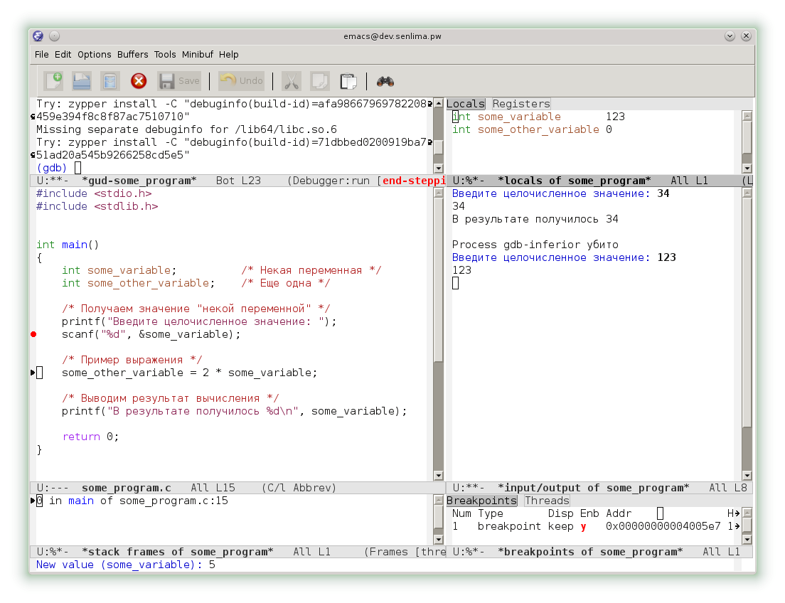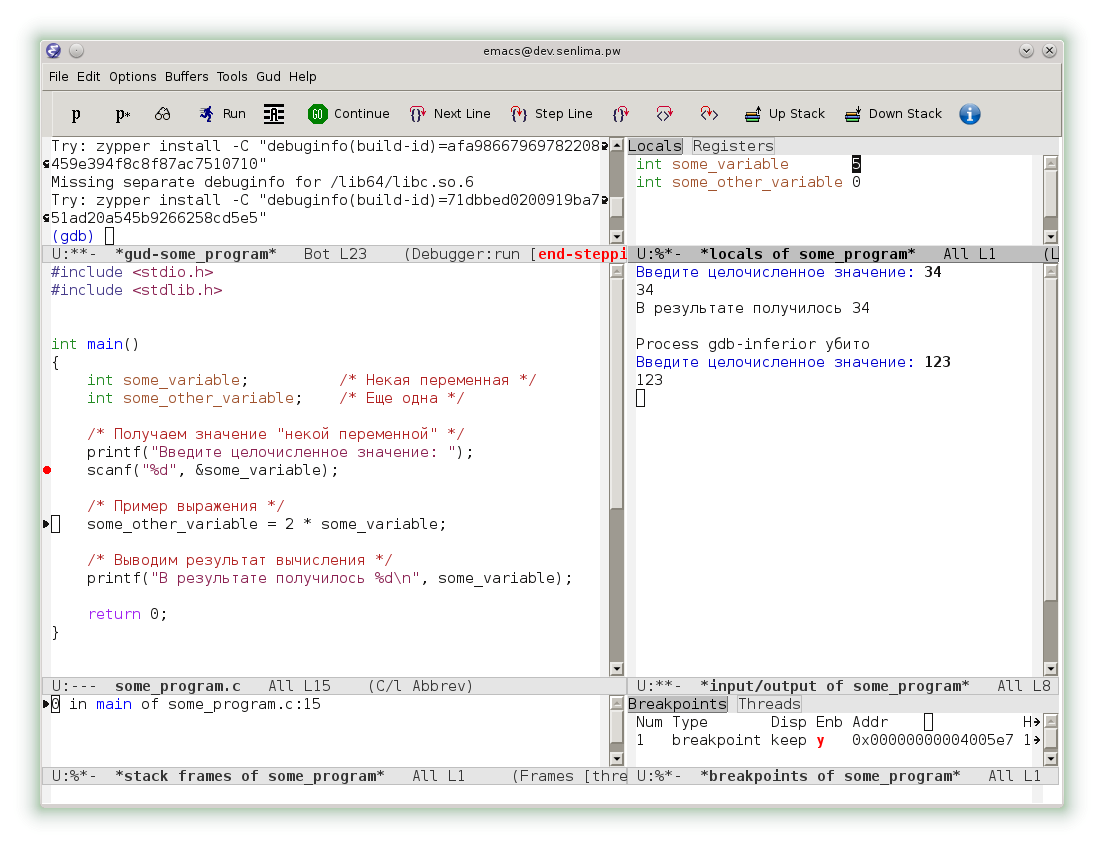 Однако, emacs предоставляет и еще более комфортный интерфейс. В меню Gud выберем раздел Gud-MI, а в нем пункт Display Other Windows. Теперь наряду с консолью gdb мы видим исходный код, локальный переменные, консоль ввода-вывода и другие окна.