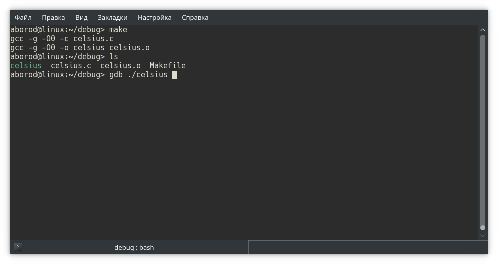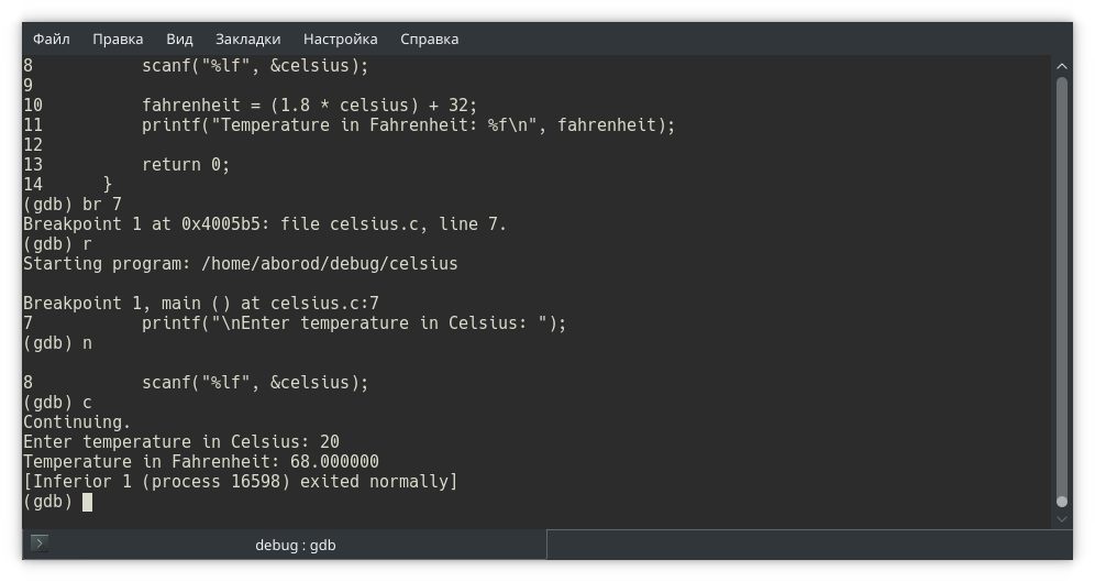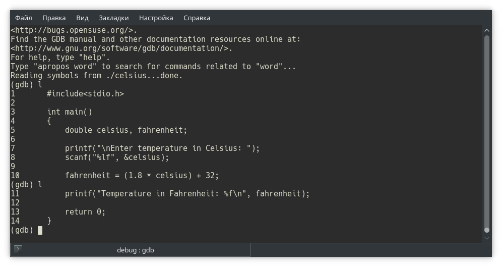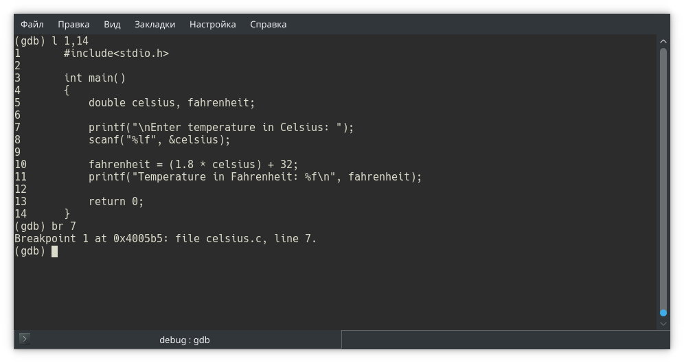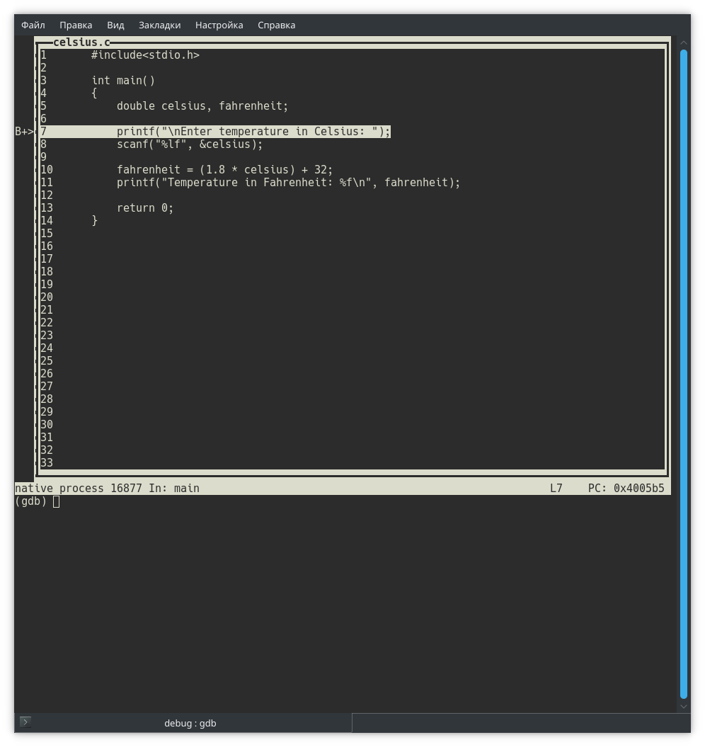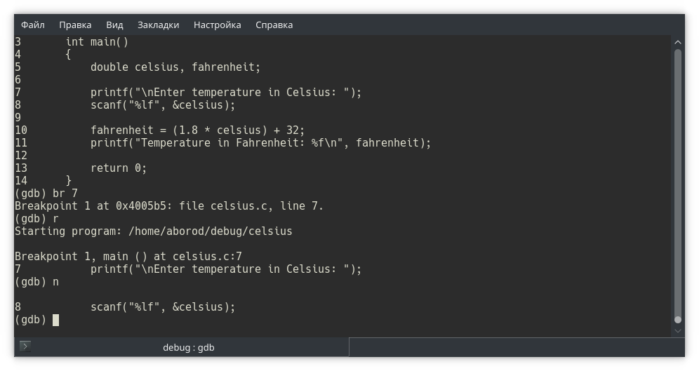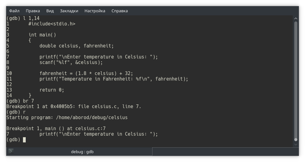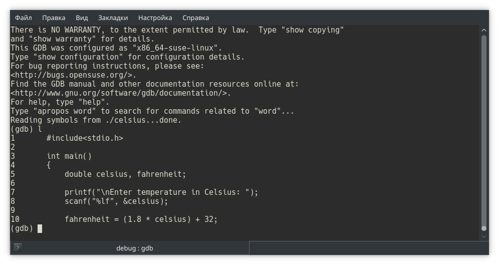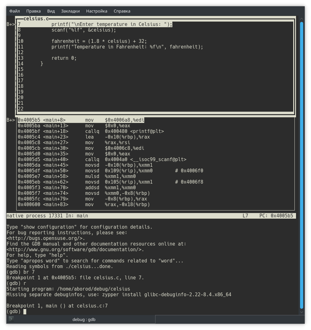 Собираем программу и запускаем в отладчике gdb. Обратите внимание: в отладчике мы открываем исполняемый файл, не исходный!