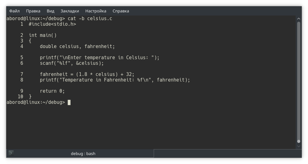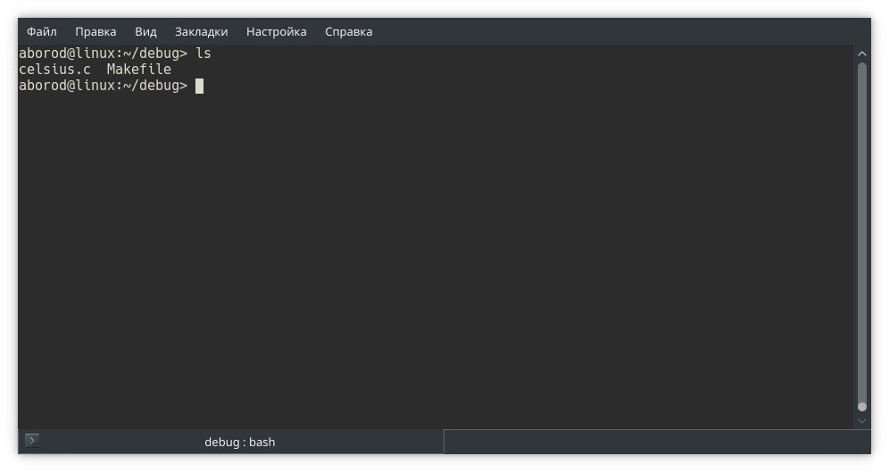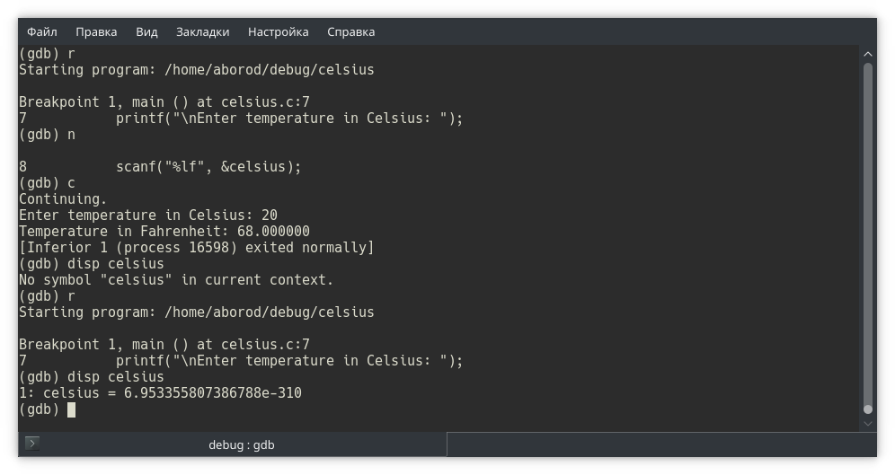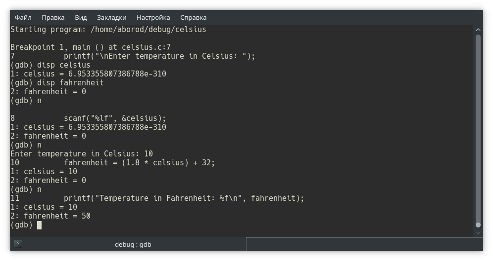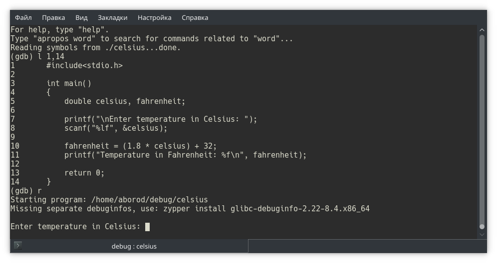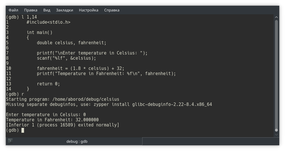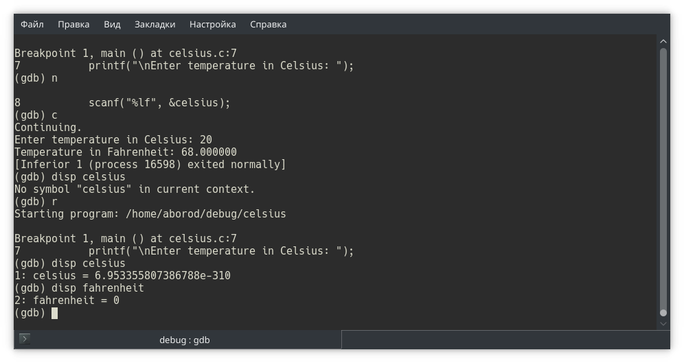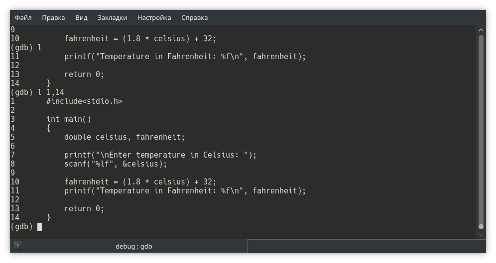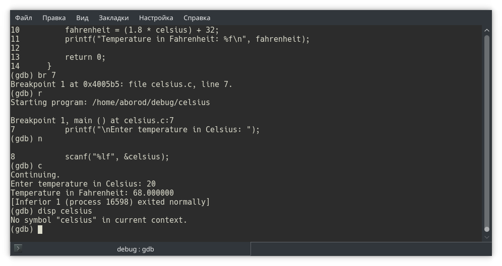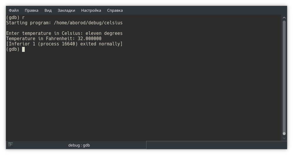 Собираем программу и запускаем в отладчике gdb. Обратите внимание: в отладчике мы открываем исполняемый файл, не исходный!