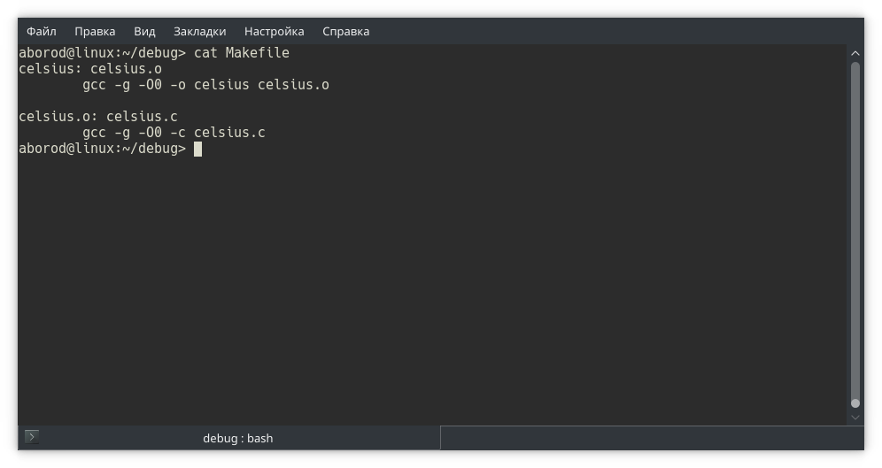 Обратите внимание, что при компиляции и сборке (в действиях Makefile) добавлены ключи -g -O0.