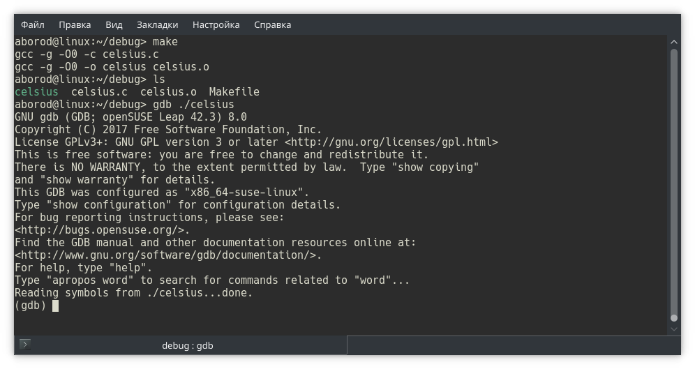 Отладчик gdb запущен и ожидает наших инструкций. Это видно по приглашению командной строки отладчика (gdb) с курсором.