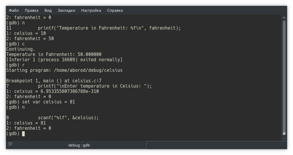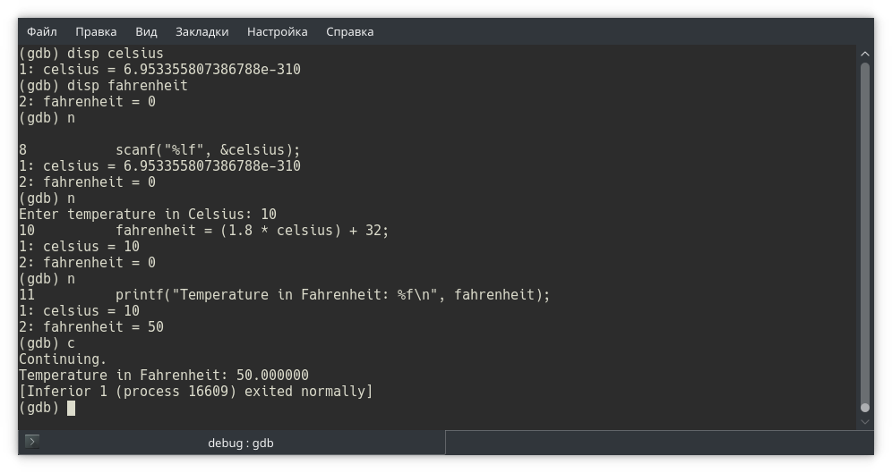 Проанализировав поведение программы в нужном участке по шагам, продолжаем выполнение до следующей контрольной точки или завершения программы командой continue (c).
