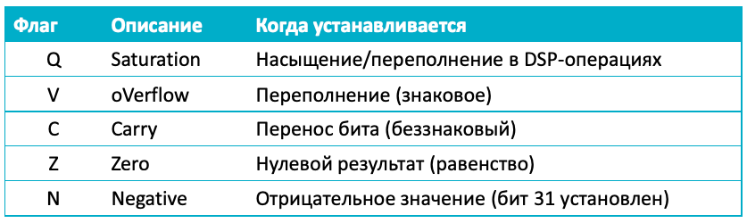 - Если команда ALU имеет суффикс ’S’, то флаги будут установлены в соответствии с результатом команды.