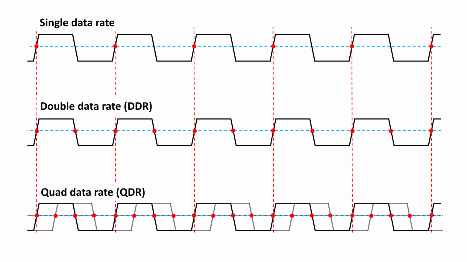 - В нём передача данных синхронизировалась по повышению и падению напряжения тактового сигнала, то есть за каждый такт данные можно было дважды передать в DRAM и обратно.