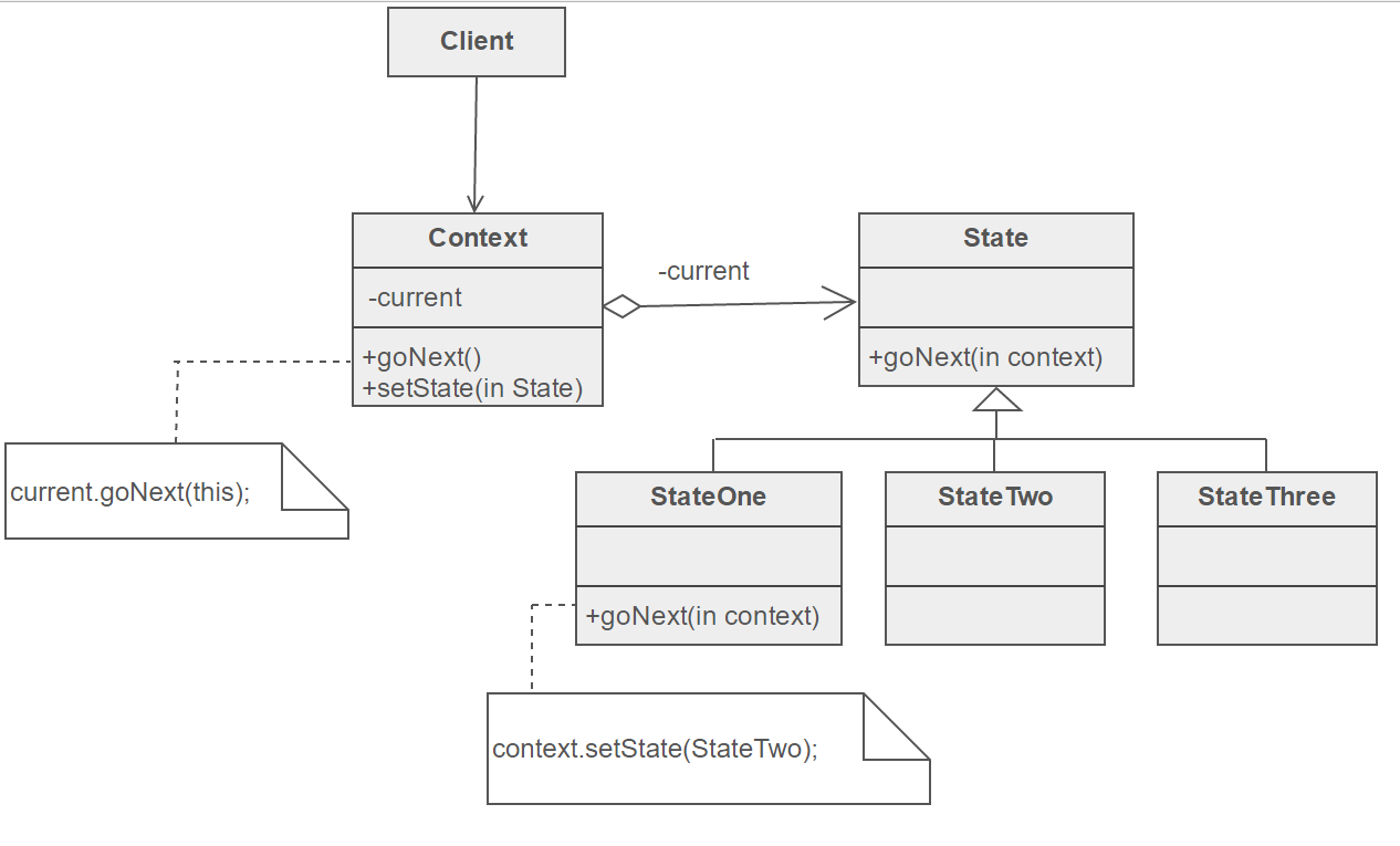 - предполагает выделение базового класса или интерфейса для всех допустимых операций и наследника для каждого возможного состояния