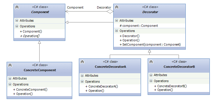 - Decorator: собственно декоратор, реализуется в виде абстрактного класса и имеет тот же базовый класс, что и декорируемые объекты. Поэтому базовый класс Component должен быть по возможности легким и определять только базовый интерфейс.